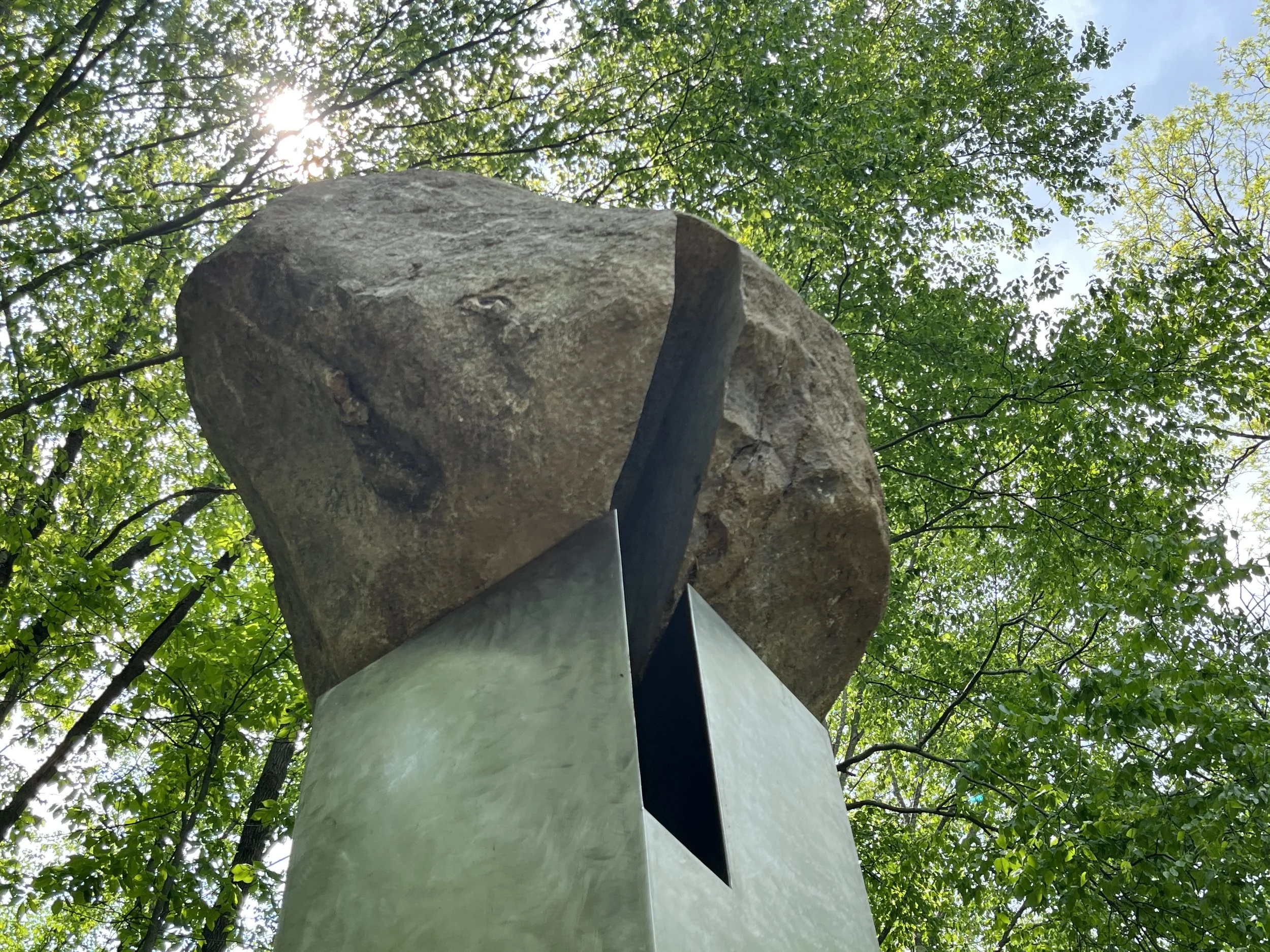 “The column sculpture consists of two volumes of different material and origin. Each volume has a distinct character. One volume is a natural boulder selected from the grounds of Crystal Park, the other is a man-made geometric form. These two volumes correspond via a common void and become as one.