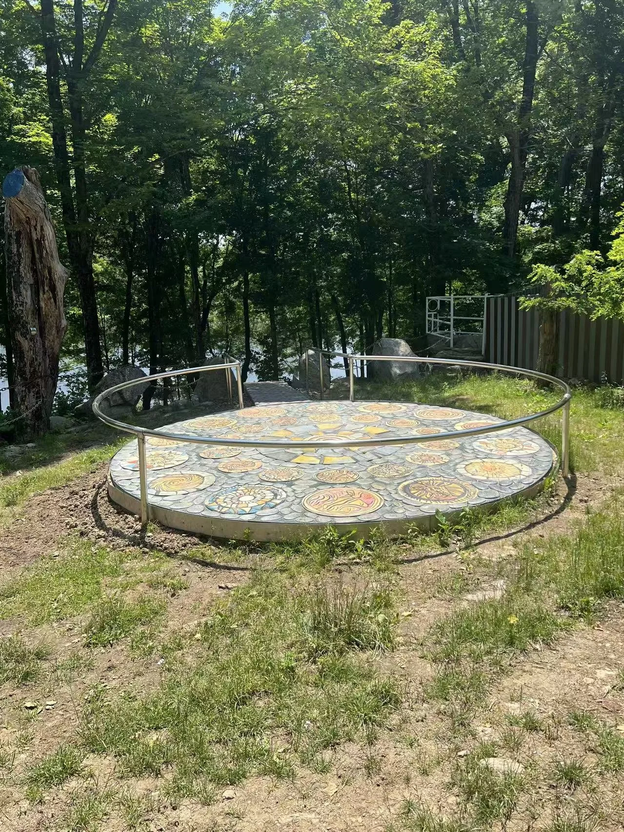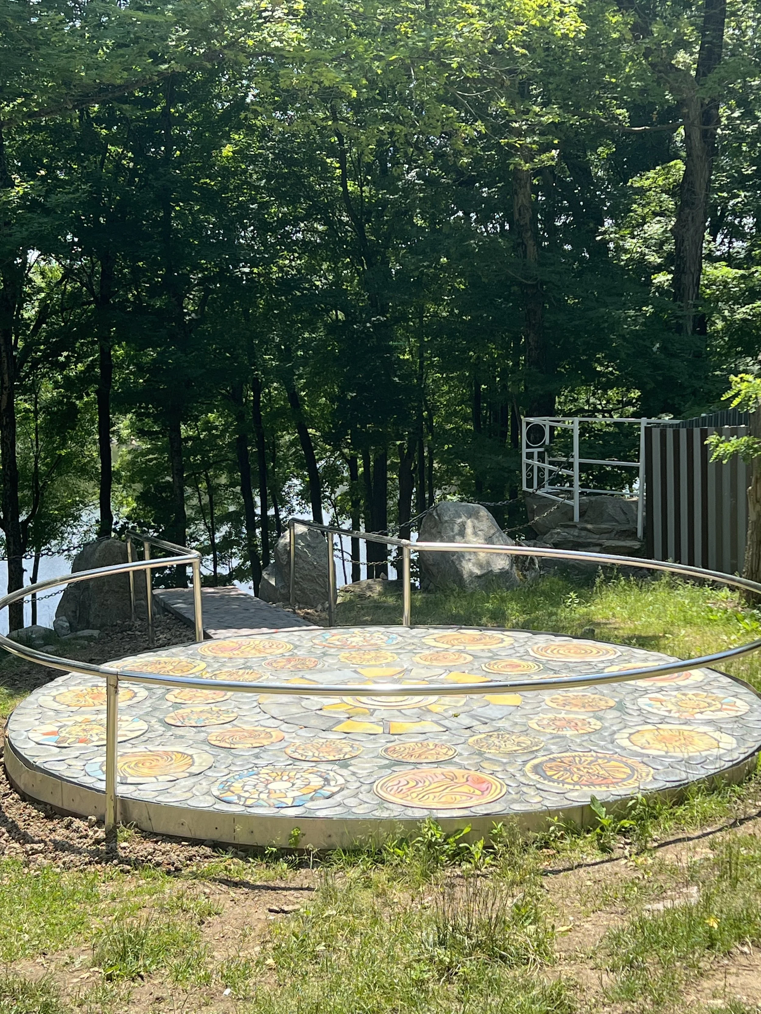 These vibrant patterns are set against a base that mimics the rough, organic appearance of natural river stones. The entire piece is subtly framed by a low, circular stainless steel railing, which visually defines the installation as a sacred space for pause and reflection.